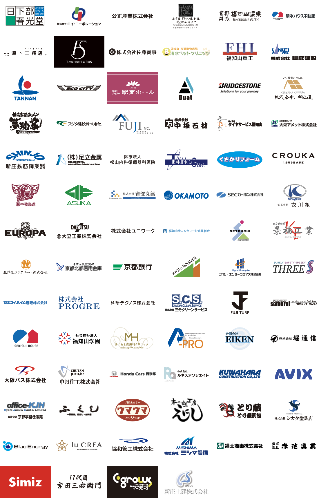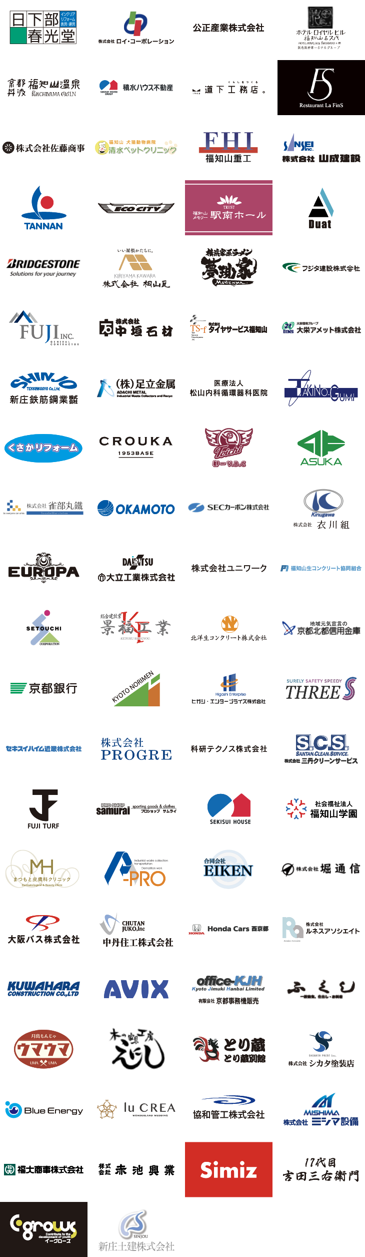 株式会社近畿地域づくりセンター / 有限会社グリーンファームソーゴ / 森下建設株式会社 / 中井税理士事務所 / ソニー生命保険株式会社 森田祐介 / 新町商店街事業協同組合 / 有限会社総運興業 / 足立木材株式会社 / 有限会社藤本工業 / マツダオートザム福知山 / 株式会社横谷 / 株式会社森田装工社 / 株式会社福知山クリーンセンター / シンセイ株式会社 / 平壌亭福知山店 / 福知山まちづくり株式会社 / 月御工業株式会社 / 医療法人社団 足立医院 / 菓樹工房きぬがわ / 社会福祉法人光福祉会 光保育園 / 社会福祉法人光福祉会 下六人部保育園 / 岸下建設株式会社 / アキラスチール株式会社 / IL PAZZINI / 野田美恵子 / ユーハン工業 / 足立石材工業株式会社 / おおむら歯科小児歯科クリニック / 塩見法律事務所 / 株式会社堀翔 / 株式会社O-TEC / 株式会社彩生建創 / ラウンジ粋 / 有限会社オートジャパン / 明治安田生命保険相互会社