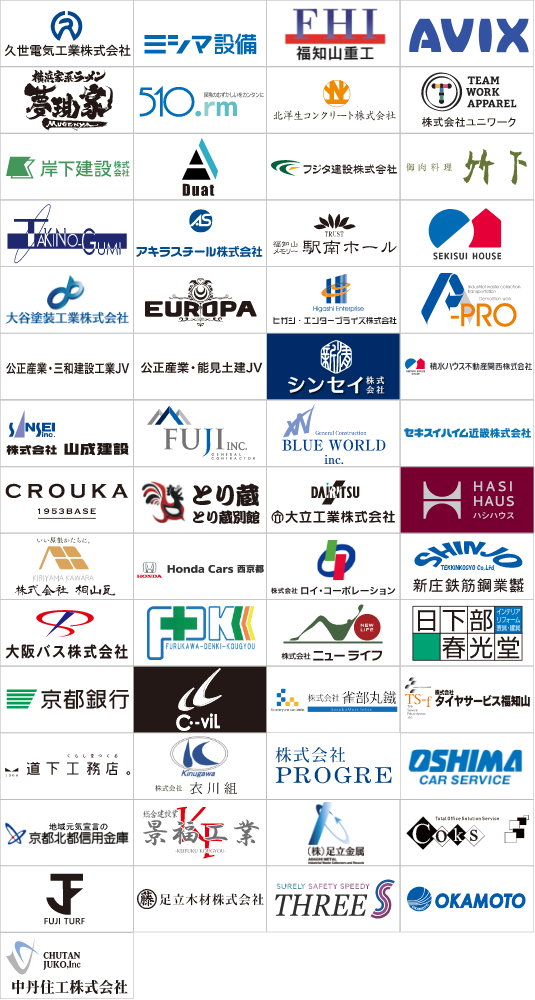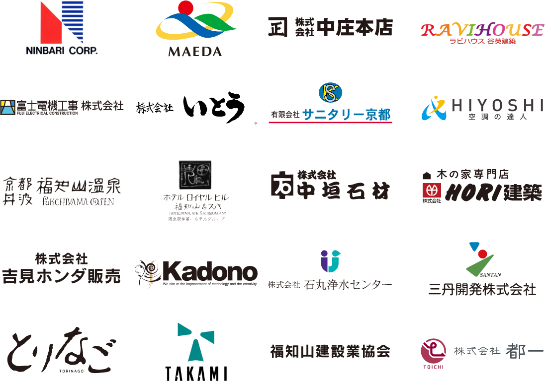 いづち医院/木の家具工房えにし/ソニー生命/kaja kaja/株式会社くさか/有限会社パセオ/ドコモショップ福知山店/有限会社立石設計/ブリヂストンタイヤ北京都販売株式会社/株式会社誠工務店/福知山フロント株式会社/有限会社JAS/清水ペットクリニック/株式会社堀翔/有限会社オートジャパン/畿北冷熱株式会社/株式会社ルネスアソシエイト/株式会社橋電/株式会社森田装工社/株式会社セレマ lu CREA/ラウンジ粋/バルにしむらーの
