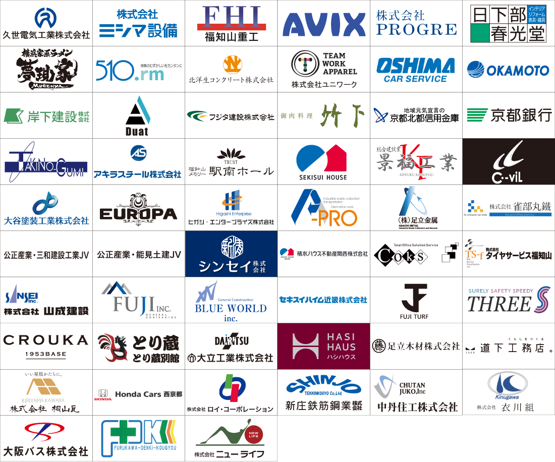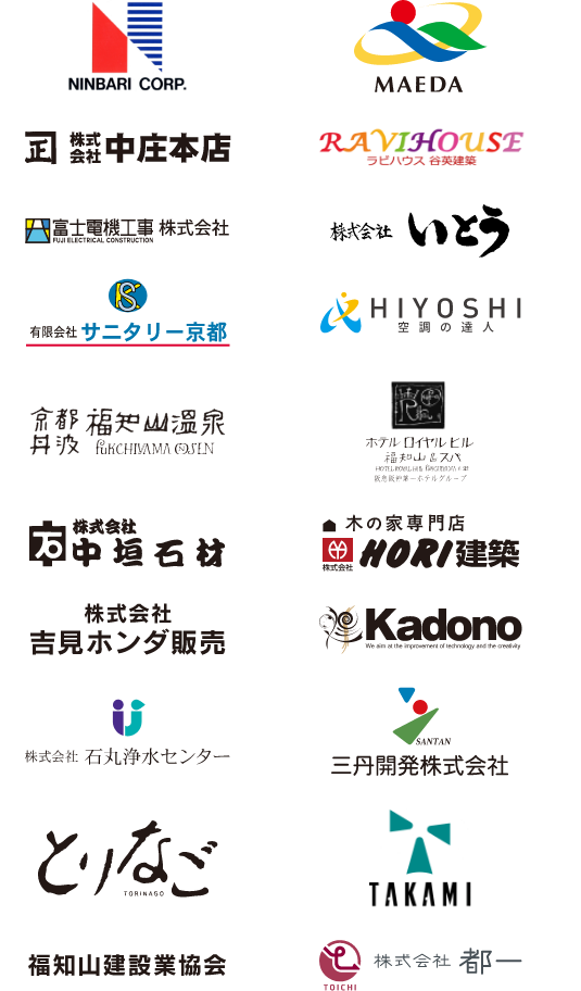 いづち医院/木の家具工房えにし/ソニー生命/kaja kaja/株式会社くさか/有限会社パセオ/ドコモショップ福知山店/有限会社立石設計/ブリヂストンタイヤ北京都販売株式会社/株式会社誠工務店/福知山フロント株式会社/有限会社JAS/清水ペットクリニック/株式会社堀翔/有限会社オートジャパン/畿北冷熱株式会社/株式会社ルネスアソシエイト/株式会社橋電/株式会社森田装工社/株式会社セレマ lu CREA/ラウンジ粋/バルにしむらーの